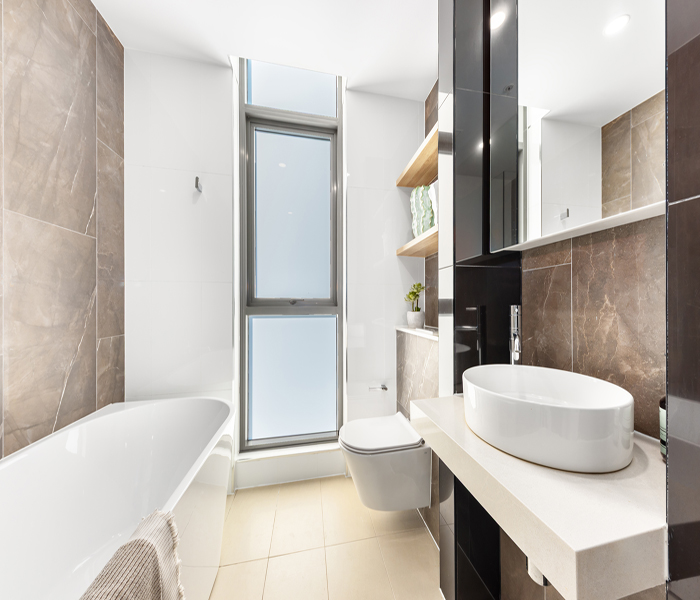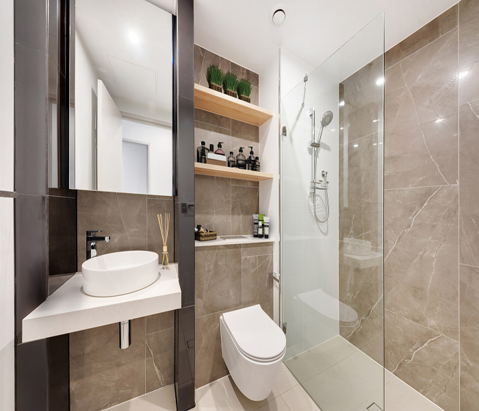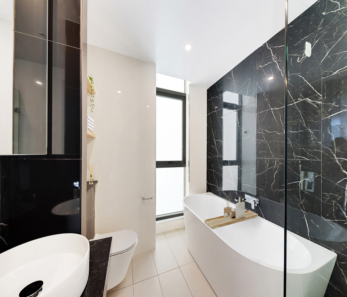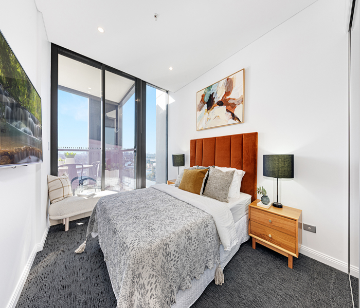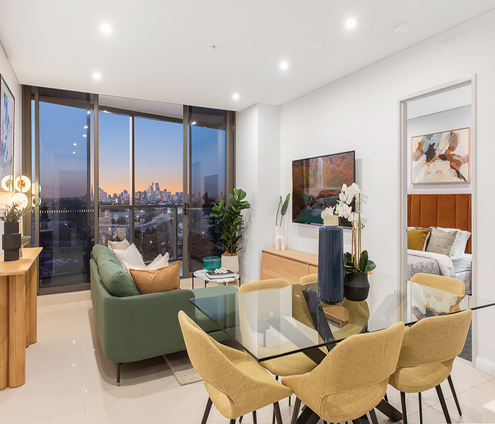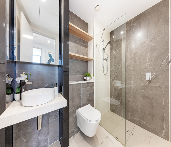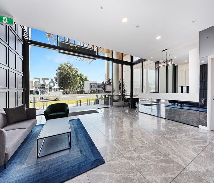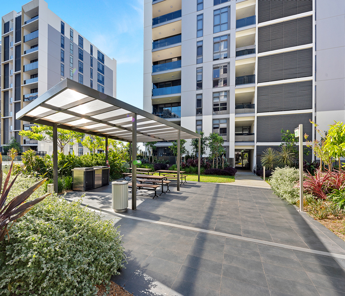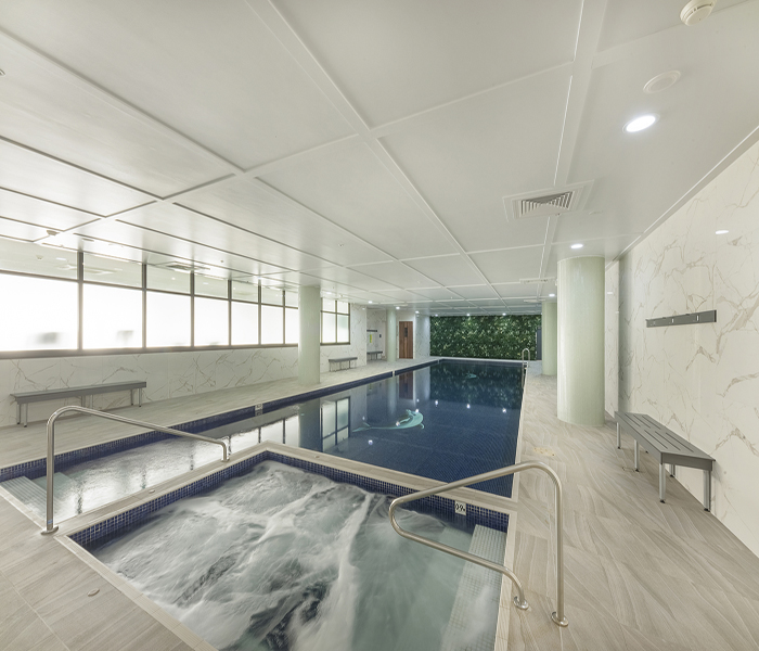 Secure building access and a warm welcoming lobby. Lush landscaped parklands with a children’s playground and manicured gardens. Indoor aquatic centre including heated lap pool, spa and sauna. Over 3000sqm of podium gardens with BBQ facilities