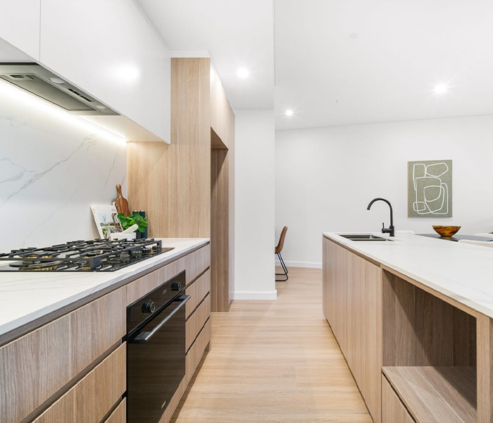 Generous 2.7m high ceilings and wide timber flooring; Open-plan living and dining areas flowing seamlessly to private outdoor spaces; Designer kitchens with Italian SMEG appliances, sleek Caesarstone benchtops, and island benches; Ducted, individually zoned Samsung inverter air-conditioning for year-round comfort